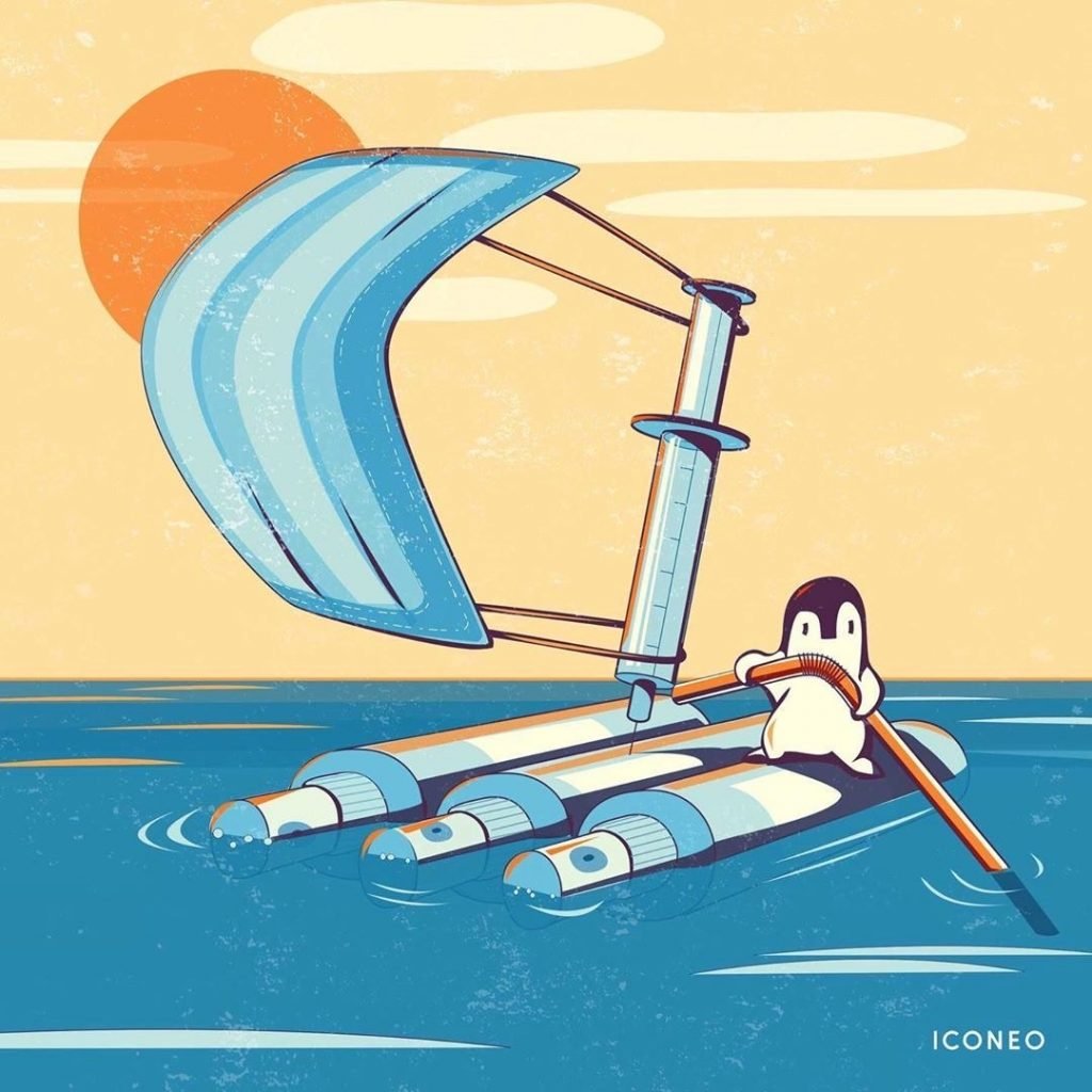 Cabe mencionar que además de esta serie de ilustraciones elaboradas a mano, ICONEO cuenta con un extenso portafolio de creaciones propias donde una vez más las mascarillas se utilizan para denunciar un tema tan delicado como lo es su contribución a la contaminación de los océanos. Dichas ilustraciones son digitales.