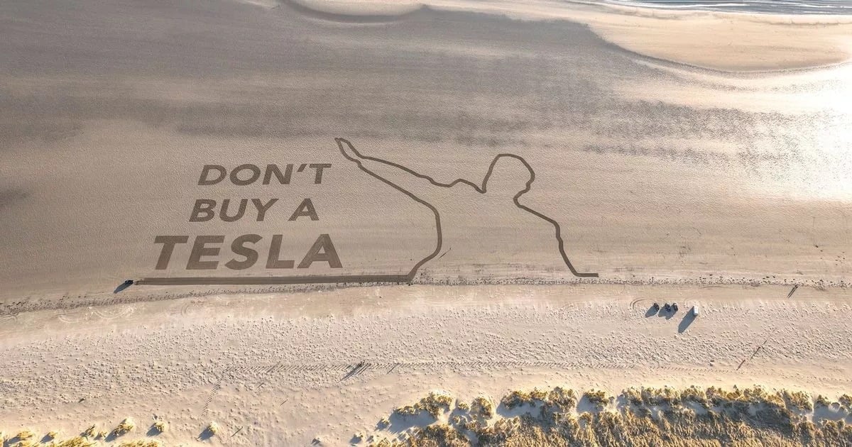 El mensaje en la arena, visible desde el aire, refuerza la campaña del grupo para desalentar la compra de vehículos Tesla. “No gasten su dinero en fomentar el extremismo y la división”, insistió Prama, quien planea desprenderse de su automóvil como parte de su protesta.