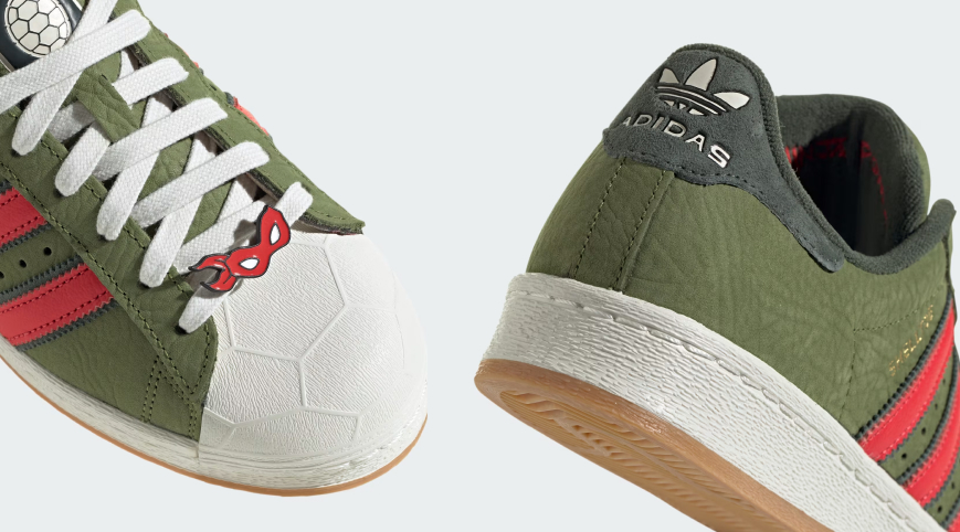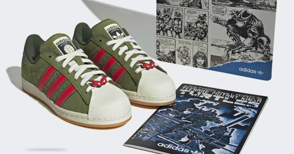 Para conmemorar el 40 aniversario de la publicación del primer comic de las Tortugas Ninja, Adidas lanza la colaboración The TMNT x adidas Superstar ‘Shelltoe’ de edición limitada valorizada en $130 en Estados Unidos. Las zapatillas cuentan con una parte superior de color verde acompañada de un patrón de caparazón de tortuga en la punta del calzado, así como un pin en la zona de los pasadores.