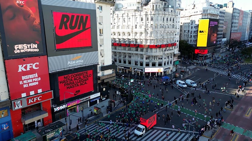 De igual manera, colocaron carteles, pantallas y pasacalles con frases de aliento, especialmente en las partes más difíciles de la carrera. En lugares clave como el Obelisco, la presencia visual de la marca fue tan fuerte que superó en su totalidad la de la organización oficial.