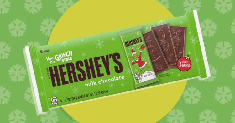 Este año, The Hershey Company va más allá e introduce la barra de chocolate del Grinch. Cada una viene envuelta en tres diseños únicos que también incluyen al perro Max y a Cindy-Lou Who.