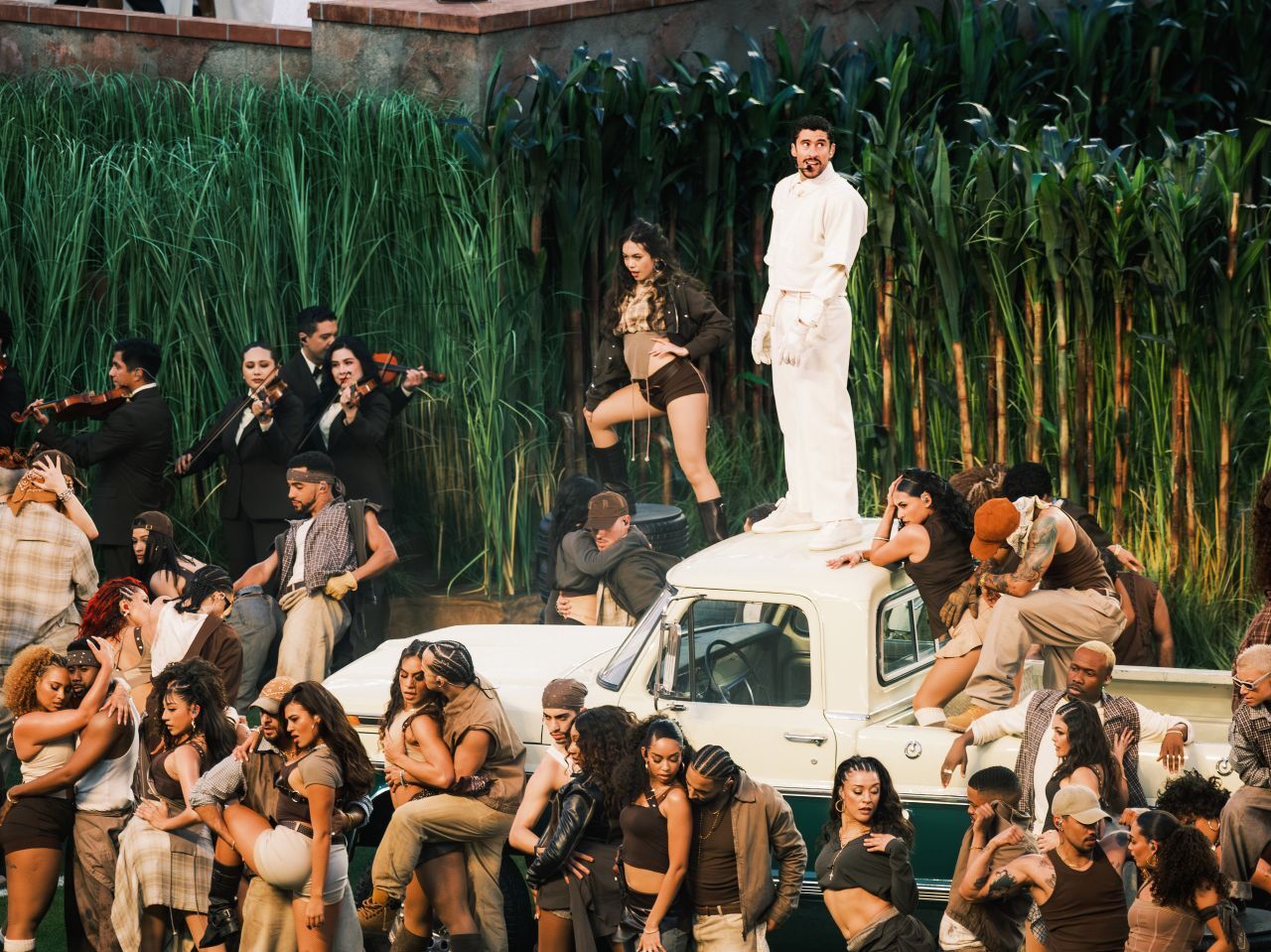 La presentación del medio tiempo de Bad Bunny estuvo marcada por referencias a la cultura latinoamericana. Desde mesas con adultos mayores disfrutando de juegos de mesa hasta puestos de manicura. La escenografía de su presentación estuvo llena de color y tradición; sin embargo, el artista puertorriqueño optó por utilizar un total white look para todo su show.