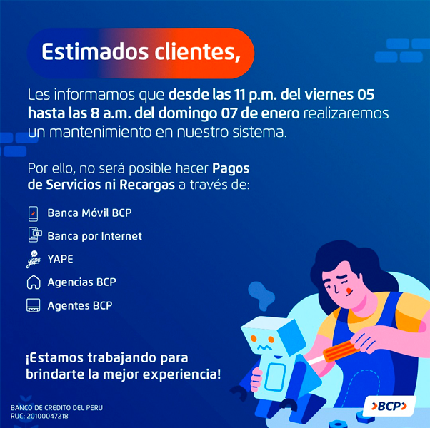 El Banco de Crédito del Perú (BCP) ha anunciado que llevará a cabo labores de mantenimiento en su sistema desde las 11:00 p.m. del viernes 5 hasta las 8:00 a.m. del domingo 7 de enero.