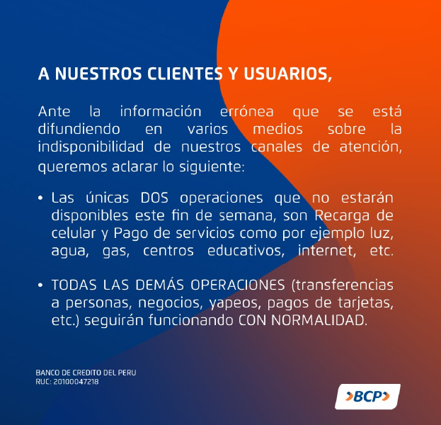 A través de su cuenta de Facebook, el BCP recomendó a sus clientes realizar con antelación los «Pagos de Servicios», tales como agua, luz, teléfono, etc., así como las «Recargas», para evitar inconvenientes.