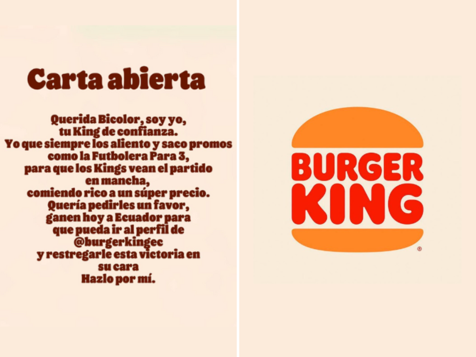“Quería pedirles un favor: ganen hoy a Ecuador para que pueda ir al perfil de @burgerkingec y restregarles esta victoria en la cara. Hazlo por mí”, se lee entre líneas en la pieza, que viene acompañada de una descripción que dice: “Te quiero, Ecuador”.
