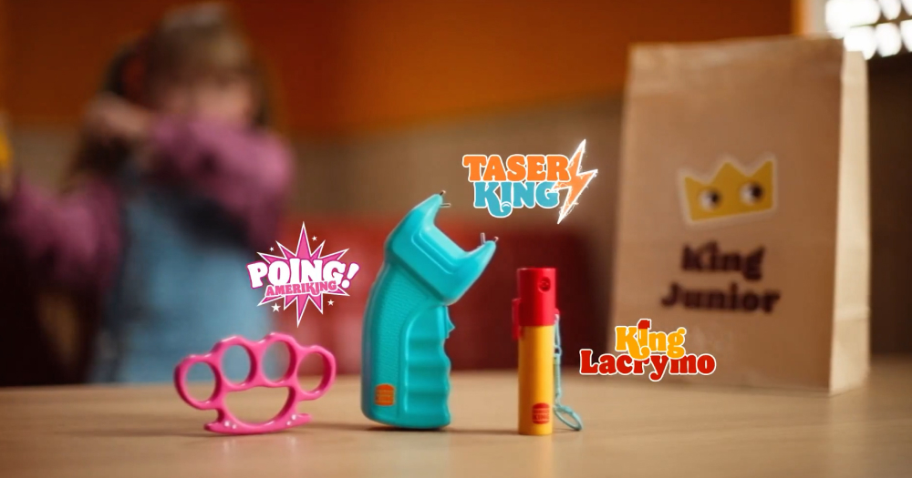 La agencia BUZZMAN estuvo a cargo de la pieza publicitaria en la que se aprecia a una niña abriendo su cajita King Junior. No obstante, al momento de retirar los clásicos juguetes con los que acostumbra venir la presentación, encuentra que estos han sido reemplazados por artefactos de defensa personal, como un taser, una manopla o un gas lacrimógeno.
