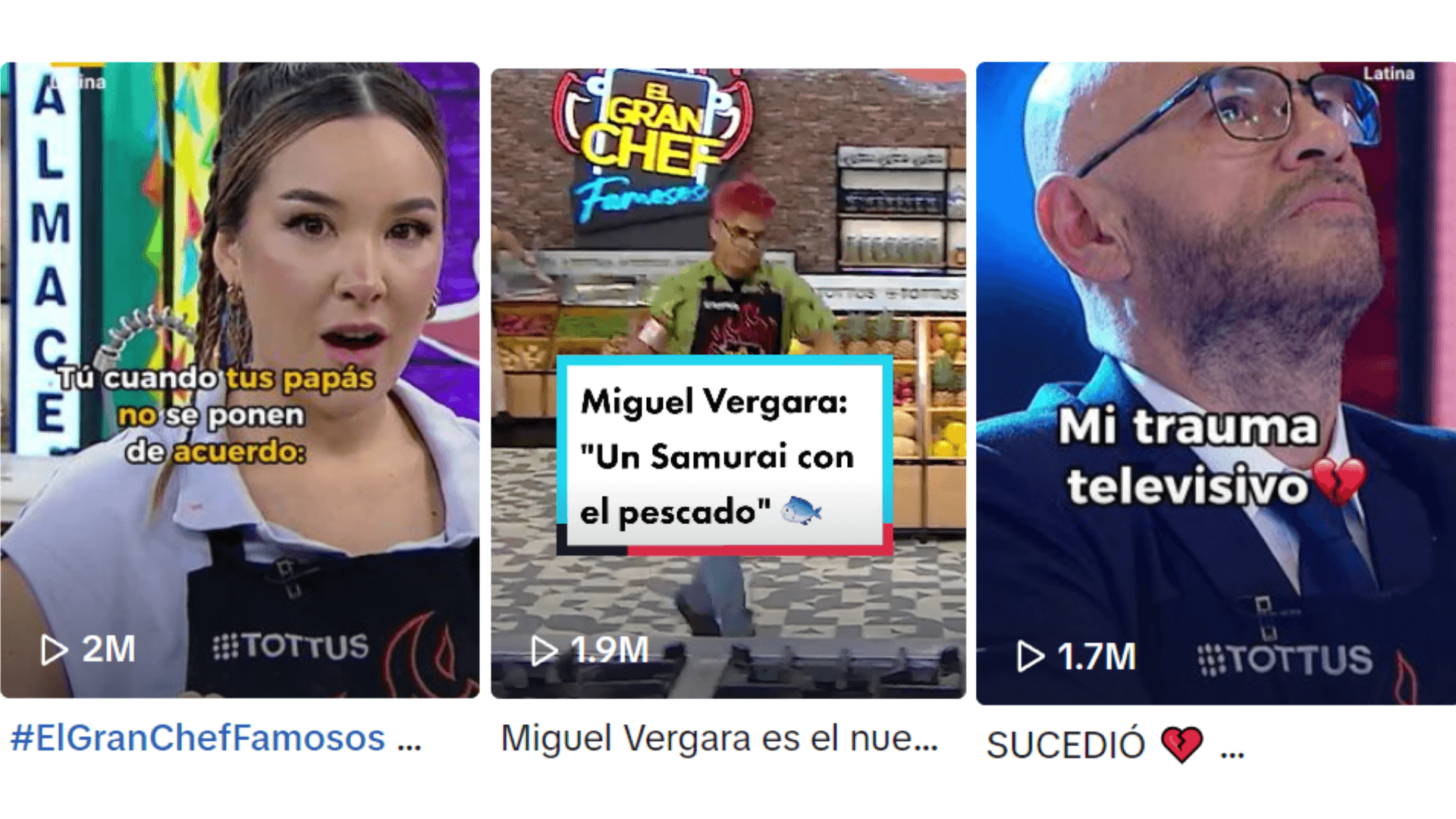 “Súbanle el sueldo al editor”, es un comentario que se repite cuando la televisora comparte contenido en TikTok. En las últimas semanas, Latina ha impulsado su contenido extrayendo clips de sus programas. La estrella actual es ‘El Gran Chef Famosos’. Algunos de sus clips superan el millón de visualizaciones. El hashtag con el nombre del programa acumula 413 millones de visualizaciones.