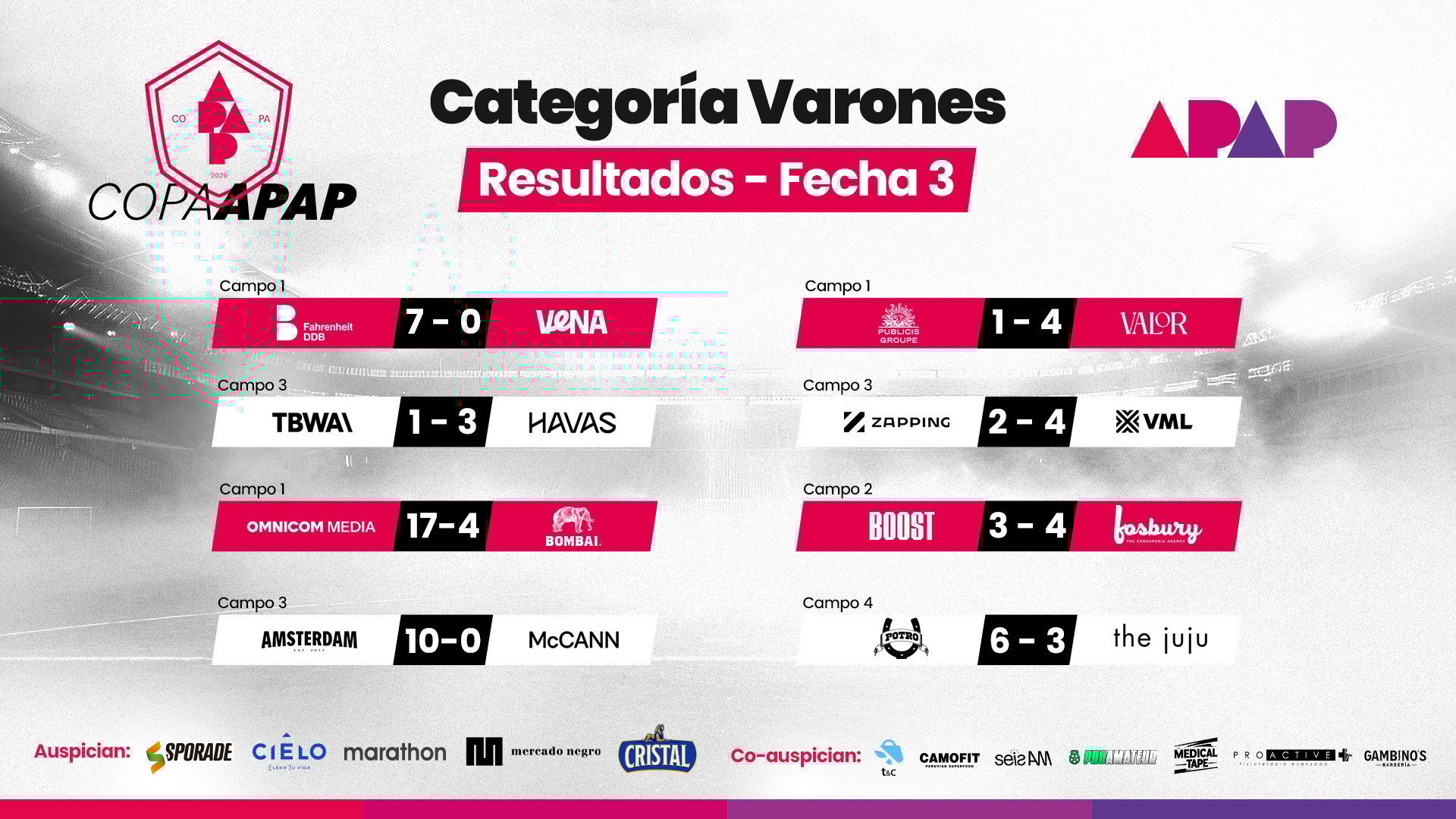 Por otro lado, en el grupo A, Publicis Groupe consolidó su pase a la siguiente etapa luego de vencer 4-0 a Mercado Negro. En tanto, TBWA superó 3-1 a Fahrenheit DDB sumando 7 puntos en total.