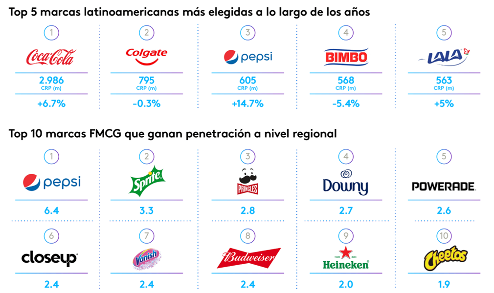 Un hecho inusual en esta tendencia de consumo es el posicionamiento de las marcas. Worldpanel cuenta con una visión local y global del consumo, por eso, identificó que pese a que en Latam dominan las marcas locales (el 60% son para marca producidas en la región), las marcas globales de bebidas tienen un lugar privilegiado. De hecho, ocupan dos puestos en el Top 5 de marcas más elegidas.