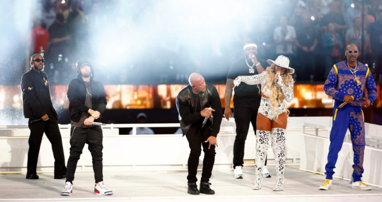 El primer lugar lo ocupa la presentación del Super Bowl LVI, encabezada por Dr. Dre, Snoop Dogg, Eminem, Mary J. Blige, Kendrick Lamar y 50 Cent. El espectáculo destacó por reunir a figuras clave del hip hop y por conectar con una audiencia que encontró en el show un momento de reivindicación cultural. Actualmente, el video acumula más de 381 millones de reproducciones, lo que lo posiciona como el halftime show más visto en la historia de YouTube hasta febrero del 2026.