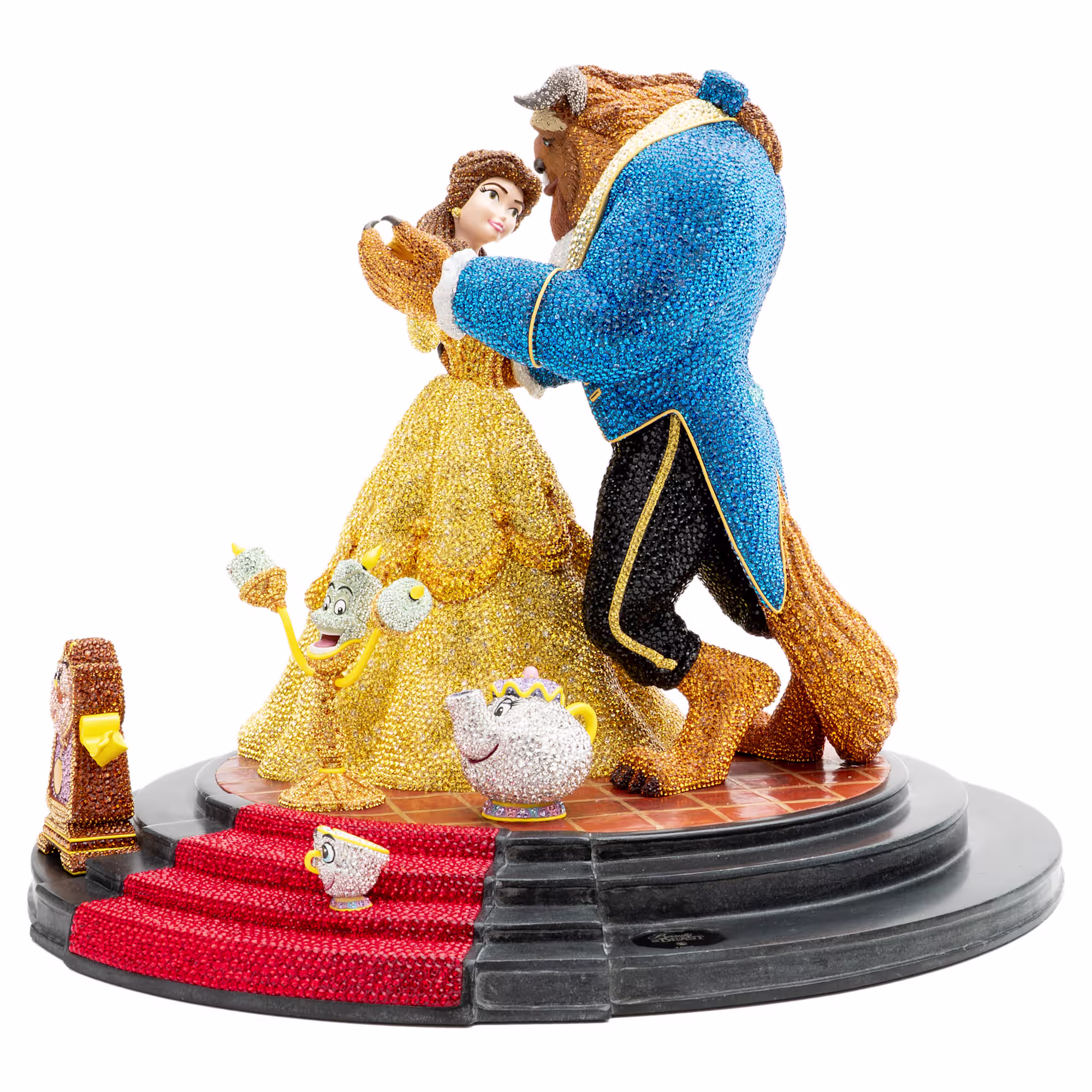 Por último, la Bella y la Bestia cobran vida en una impresionante figura de 52.900 cristales para capturar el crescendo emocional de la historia con un brillo deslumbrante. La mágica primera danza se reinventa con 26 colores diferentes, mostrando el mejor savoir-faire de Swarovski con un detalle exquisito. Esta pieza también incluye una versión miniatura de Din Don, Sra. Potts y Lumière.