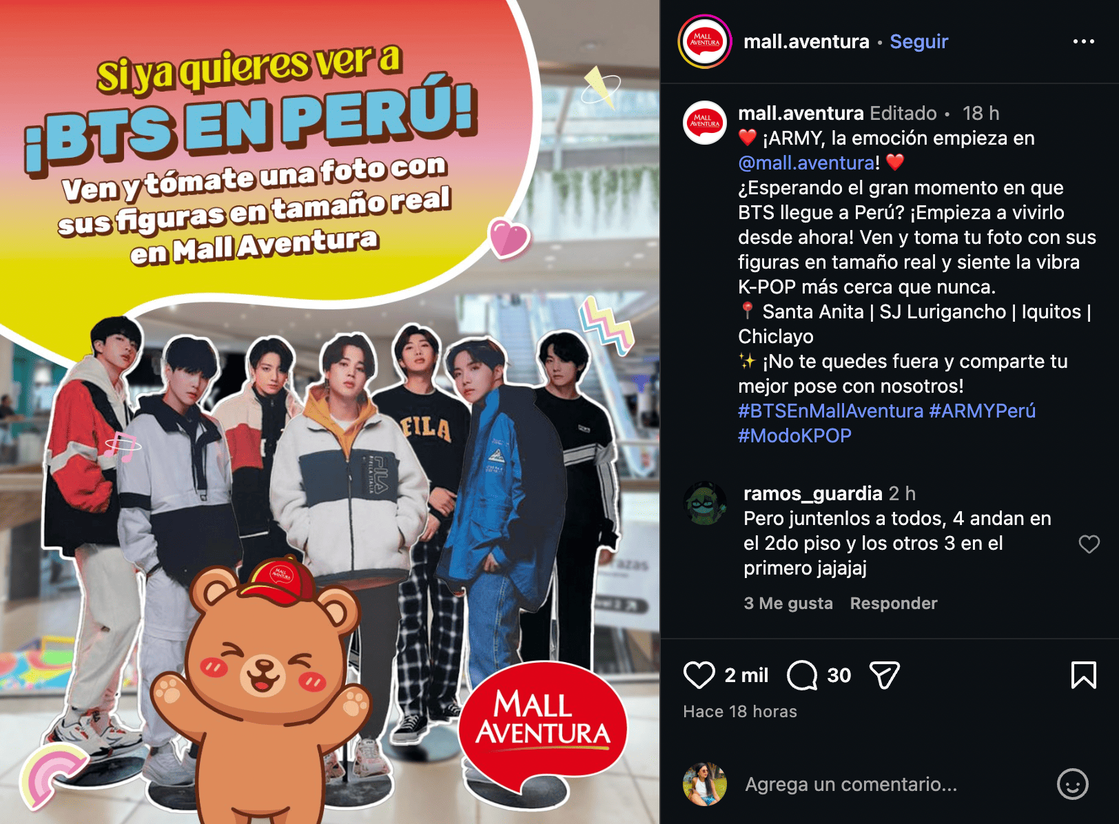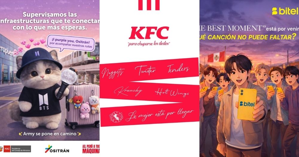 Entre esta lista destaca KFC, Bitel, Entel y Mall Aventura, quienes optaron por utilizar las referencias a BTS para promocionar sus productos o servicios. Con un toque de humor y evidentes referencias al anunciado concierto, las marcas aprovecharon la oportunidad para generar engagement.