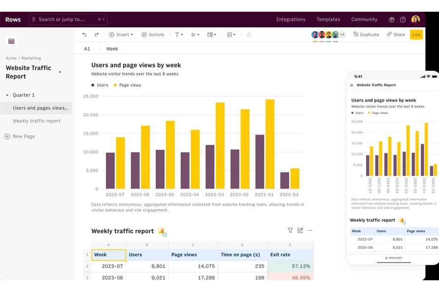 Una vez ingresado a Rows, la plataforma dividirá el espacio de trabajo en diferentes páginas y cada una se llenará con elementos diferentes como tablas, textos y gráficos a modo de plantilla. Este proceso aparecerá de forma predeterminada de acuerdo a lo que se indicó en un inicio al sistema.