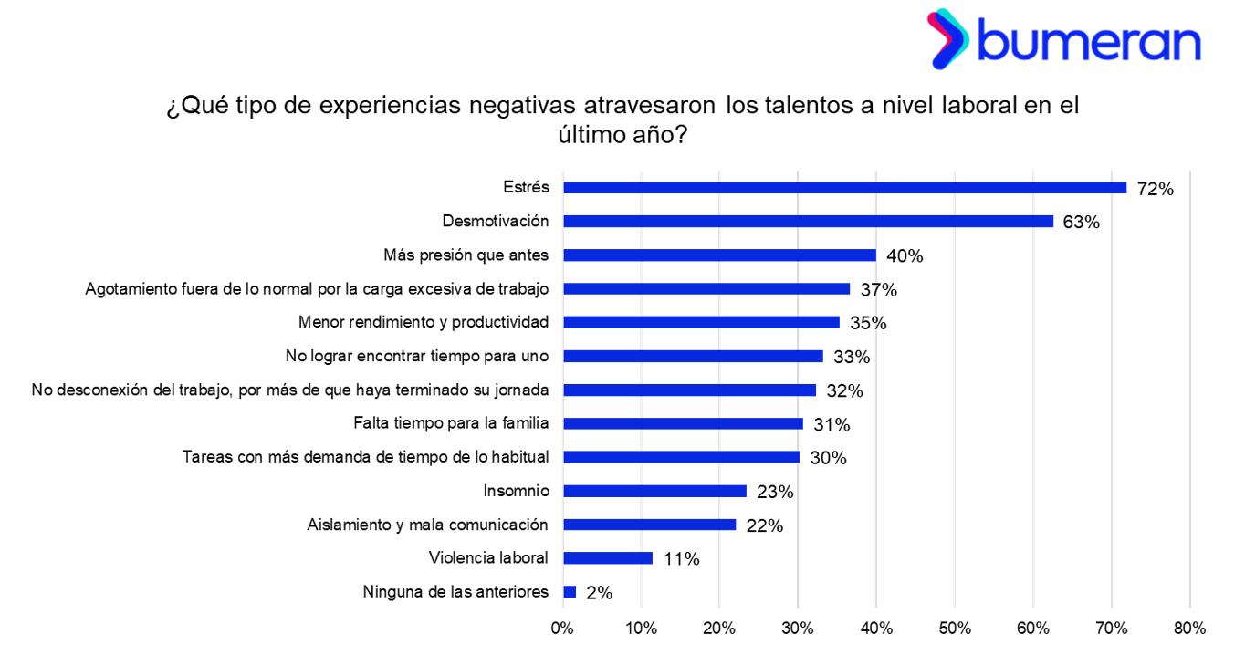 Por otro lado, según el estudio, siete de cada 10 talentos aseguran haber sentido estrés este año. Asimismo, el 63% se siente desmotivado; el 40% siente más presión que antes; el 37% siente agotamiento; y el 35% indica sentirse con menor rendimiento y productividad.