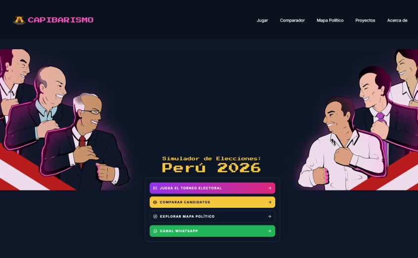 “Capibarismo” es quizá la propuesta más disruptiva de las mencionadas, pues ofrece un simulador de elecciones a modo de un juego llamado “Torneo Electoral”. Esto incluye información sobre educación, experiencia laboral, ingresos, propiedades y sentencias de los candidatos. La web fue desarrollada por Italo Sayán, Daniel González y Aldo Delgado; mientras que las ilustraciones y la distribución, estuvieron a cargo de Carlo Parodi, mejor conocido como “Cheesy Chains”.
