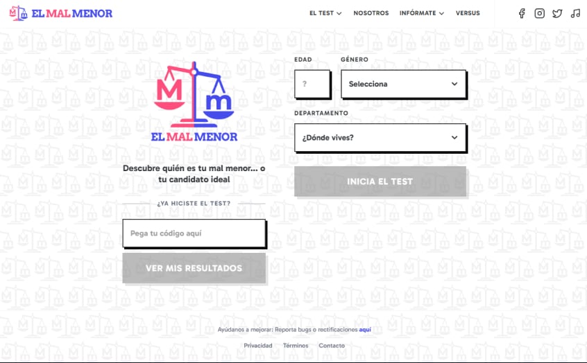 “El Mal Menor” es un portal, creado por José Burga y Paloma Izquierdo, en el cual los usuarios pueden realizar un test de 30 preguntas para descubrir a su candidato a la presidencia ideal o, en su defecto, al “mal menor” con el que más se identifican. La página también cuenta con información de cada uno de ellos, así como un blog de análisis.
