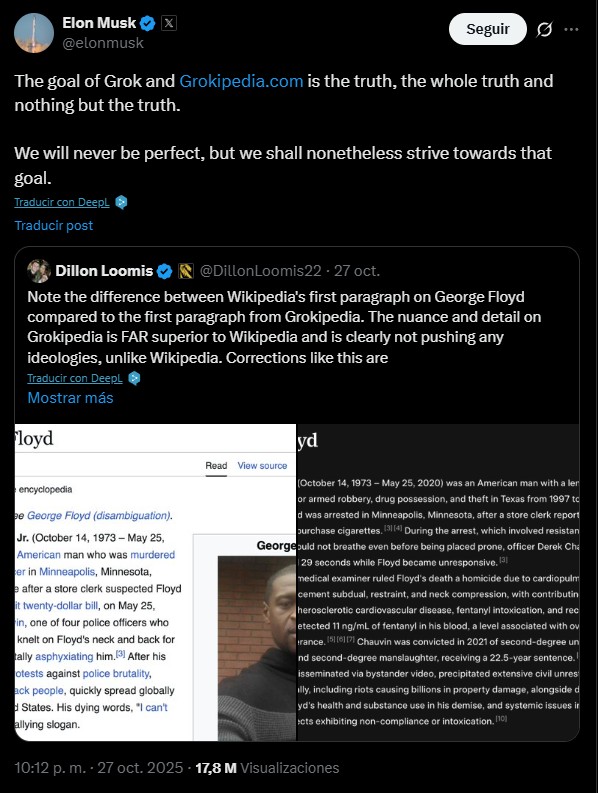 En su anuncio, Musk describió Grokipedia como un proyecto centrado en «la verdad, toda la verdad y nada más que la verdad». Actualmente, el sitio cuenta con poco más de 800 mil artículos, un número modesto frente a los más de siete millones disponibles en Wikipedia, pero que representa el primer paso hacia un sistema de información solo gestionado por IA.