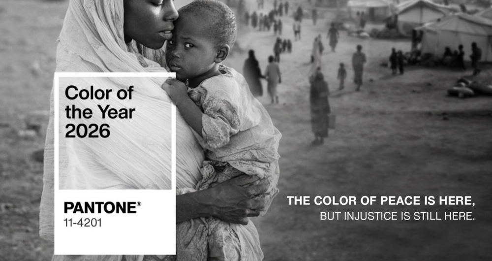 La agencia lanzó una serie de piezas que yuxtaponen el color del año con escenas que retratan desplazamiento, pobreza, crisis ambientales y violencia estructural. Asimismo, las imágenes en blanco y negro refuerzan el contraste entre el ideal estético y la urgencia social.