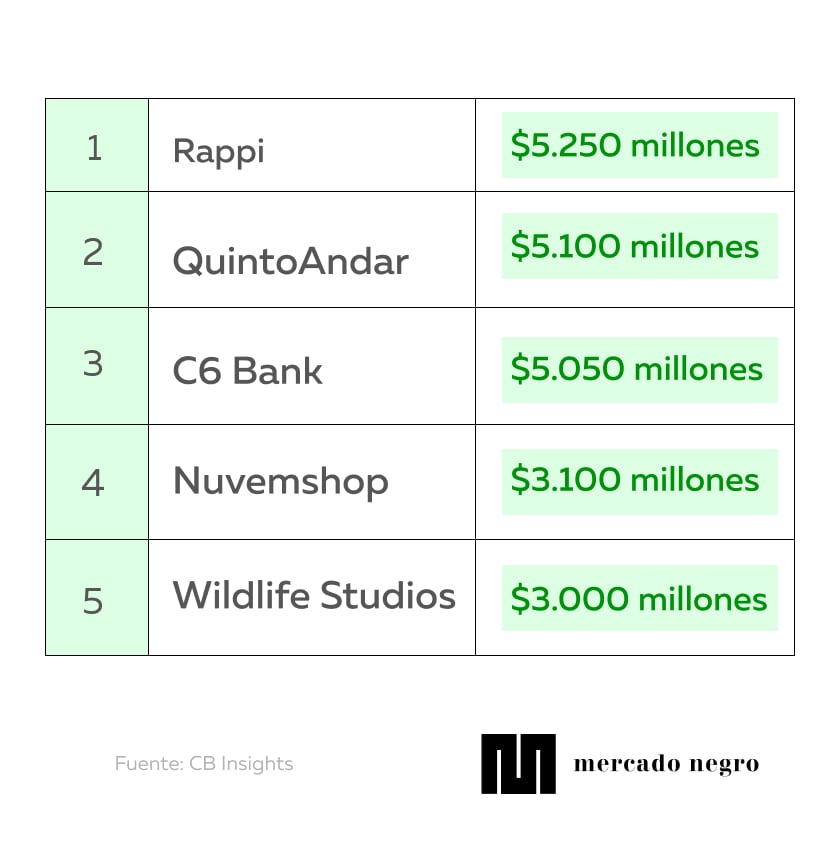 De acuerdo a los datos publicados por CB Insights, Rappi lidera el ranking de unicornios tecnológicos en Latinoamérica con un valor de 5.250 millones de dólares. En segundo lugar, está ubicado QuintoAndar, cuyo modelo de negocio ha alcanzado los 5.100 millones de dólares este año.