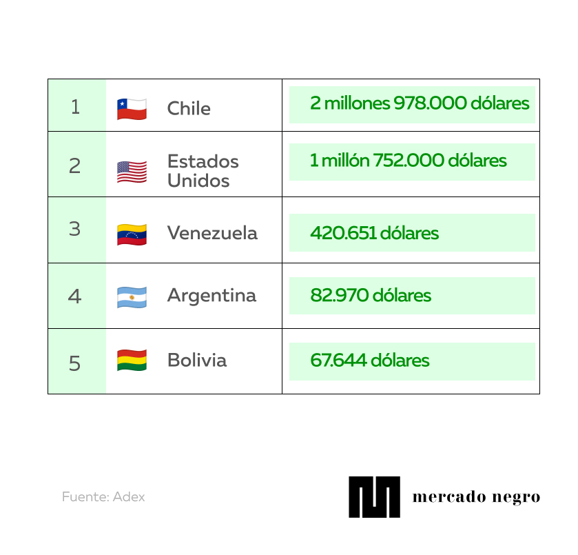 Según Adex, hasta octubre del 2025, Chile registró pedidos por 2 millones 978.000 dólares entre enero y octubre del 2025, por lo que es el mercado que lidera la demanda. Estados Unidos está ubicado en el segundo lugar con 1 millón 752.000 dólares.