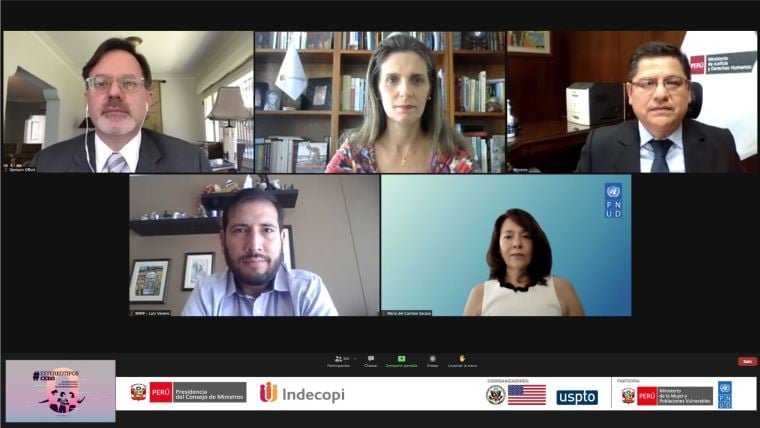 Esta presentación se llevó a cabo durante el seminario web ‘#EstereotiposCero: mujer creativa, mujer innovadora y mujer emprendedora’, realizado con el propósito de destacar y promover la participación de la mujer en los ámbitos de la propiedad intelectual, el mismo que contó con la participación del Ministro de Justicia y Derechos Humanos, Eduardo Vega Luna; de la representante residente del Programa de Naciones Unidas para el Desarrollo (PNUD), María del Carmen Sacasa; y del Encargado de Negocios Ad Interim de la Embajada de los Estados Unidos de América. Denison Offutt y de la presidenta del Consejo Directivo del Indecopi, Hania Pérez de Cuéllar.
