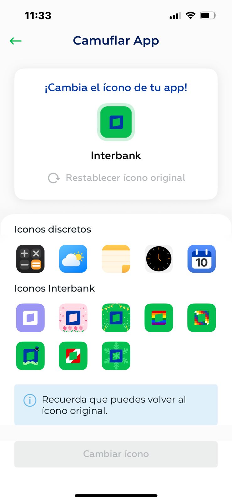 La nueva opción de seguridad, lo que hace es brindarle al usuario la alternativa de ocultar la app de su entidad bancaria. Esto mediante el cambio del ícono de Interbank, caracterizado por llevar su logo, por otro más discreto y que a simple vista puede dar la impresión de que la persona no cuenta con su aplicativo instalado.