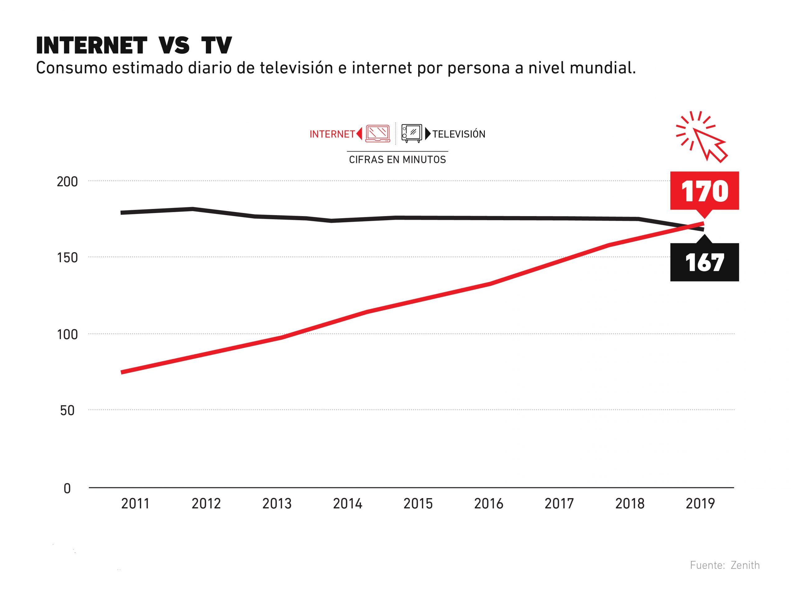La firma Zenith reveló recientemente información que sin duda será de sumo interés para las marcas, por primera vez se llegó al punto de inflexión en el que el consumo de internet superó al consumo de televisión a nivel global. Según los datos mostrados, en lo que va del año el consumo promedio de internet logró situarse en los 170 minutos por persona al día, mientras que en el caso de la televisión se redujo a 167 minutos.