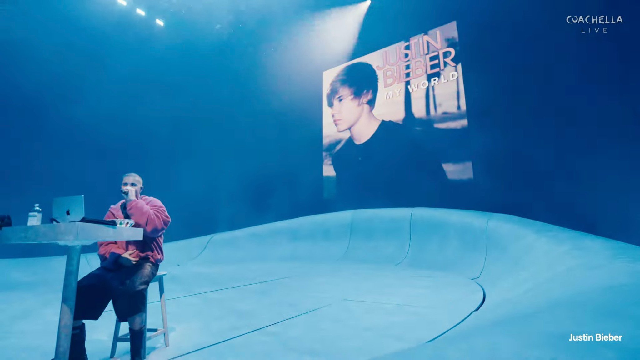 Uno de los grandes motores para impulsar sus canciones más antiguas fue la búsqueda en vivo de estas a través de YouTube. En medio de su performance, el cantante tomó su laptop para buscar sus éxitos más antiguos como “Baby”.