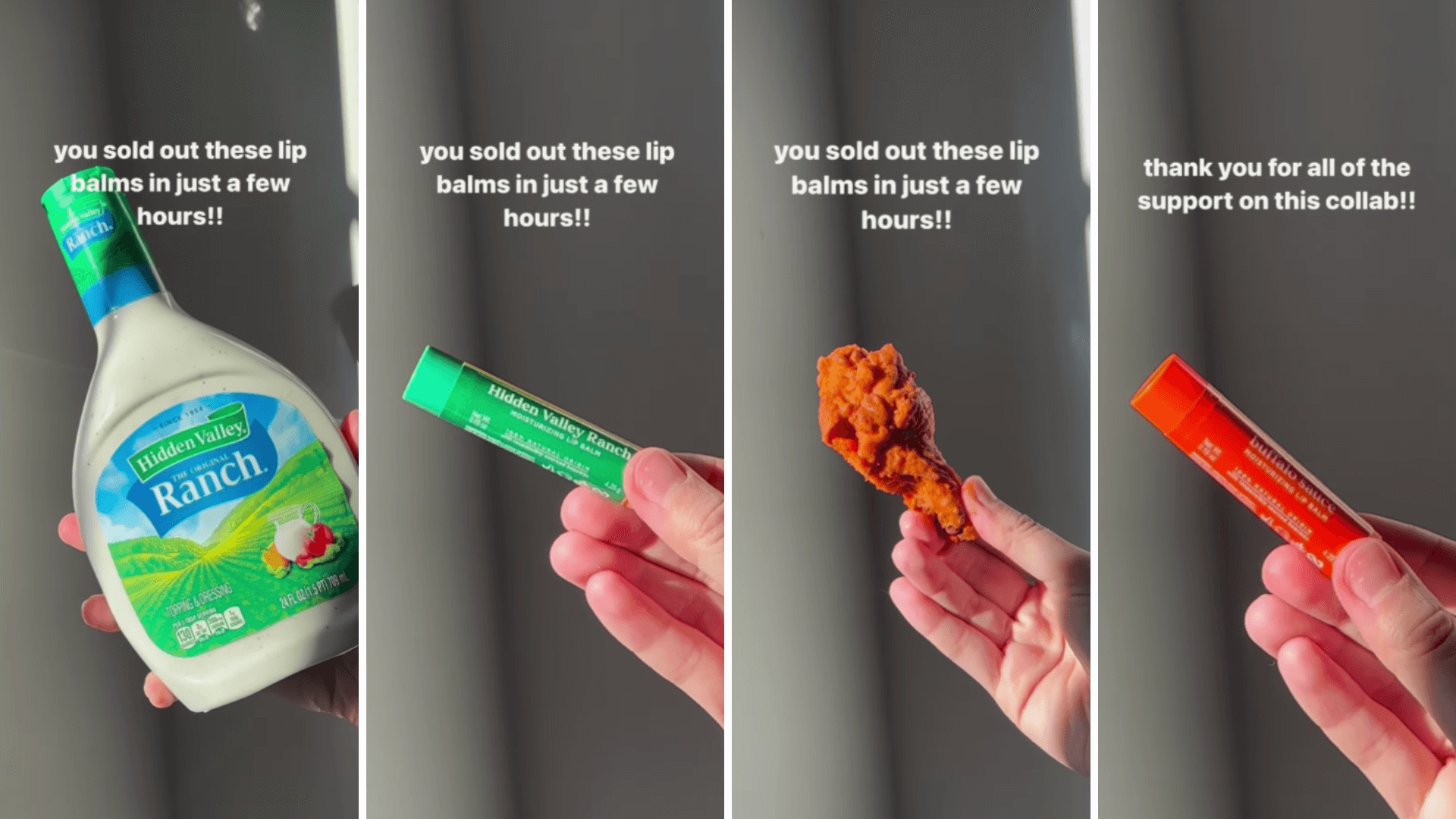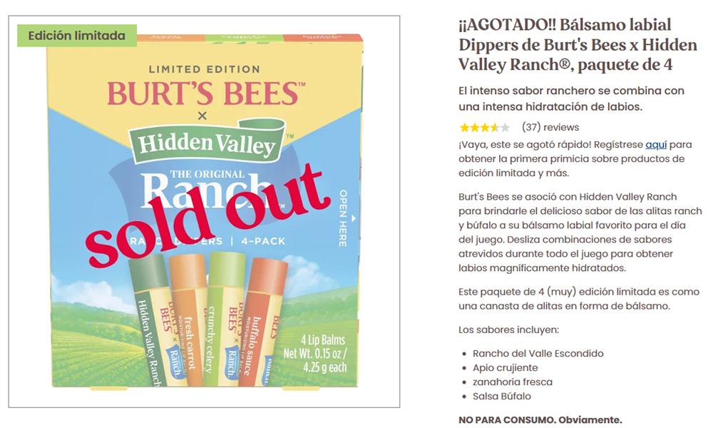 Esta historia de éxito surgió como una broma por el Día de los Inocentes. La marca cosmética Burt’s Bees y Hidden Valley Ranch, proveedora de condimentos, anunciaron una colaboración peculiar. Se trataba de un juego de bálsamos labiales que saben a alitas de pollo. El pack incluía sabores como salsa búfalo, apio crujiente, zanahoria fresca y la marca registrada Hidden Valley Ranch.