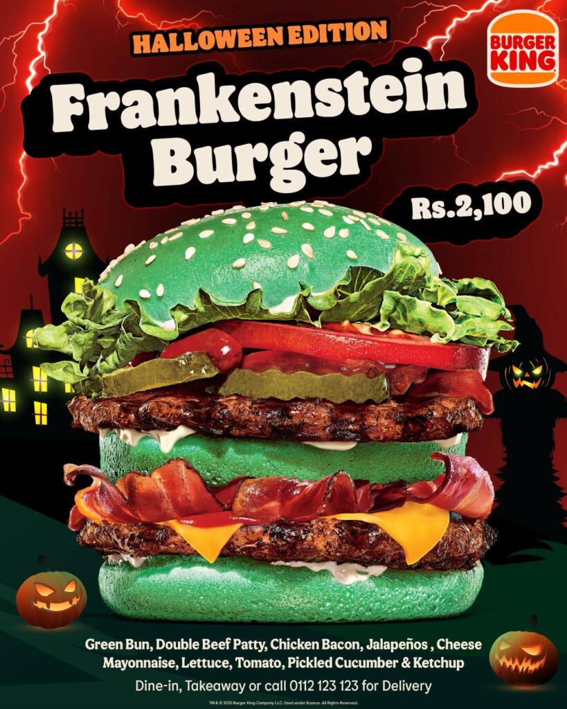 Burger King Sri Lanka celebra Halloween con la Frankenstein Burger, una hamburguesa que destaca por su pan verde y su combinación de sabores audaces. La receta incluye doble carne flame-grillada, bacon de pollo, jalapeños, lechuga, tomate, pepinillos y las salsas clásicas de la marca, creando un producto que llama la atención tanto por su aspecto como por su sabor.