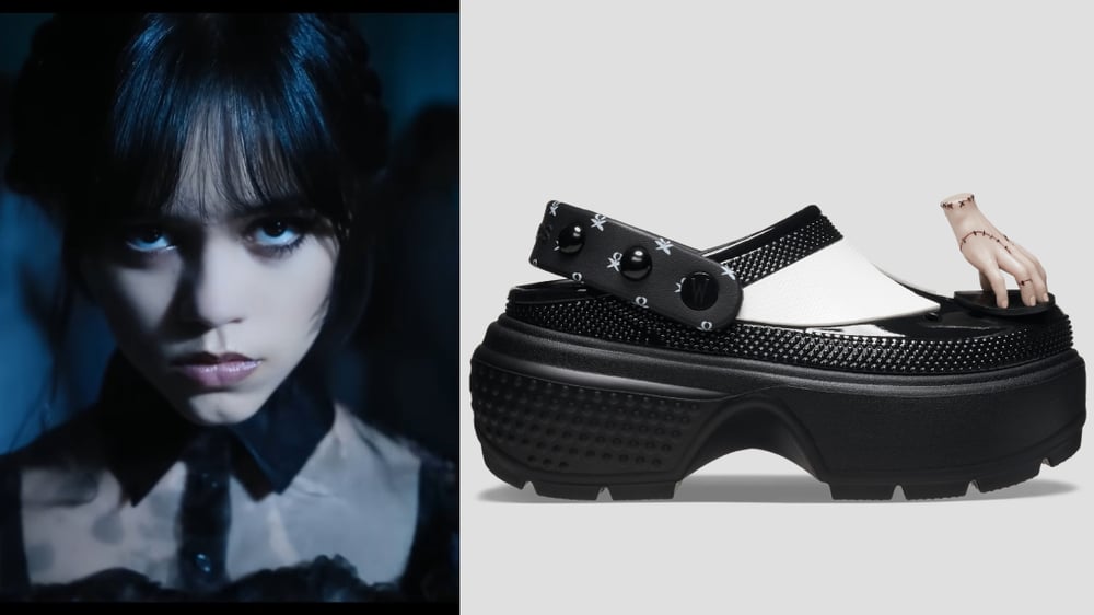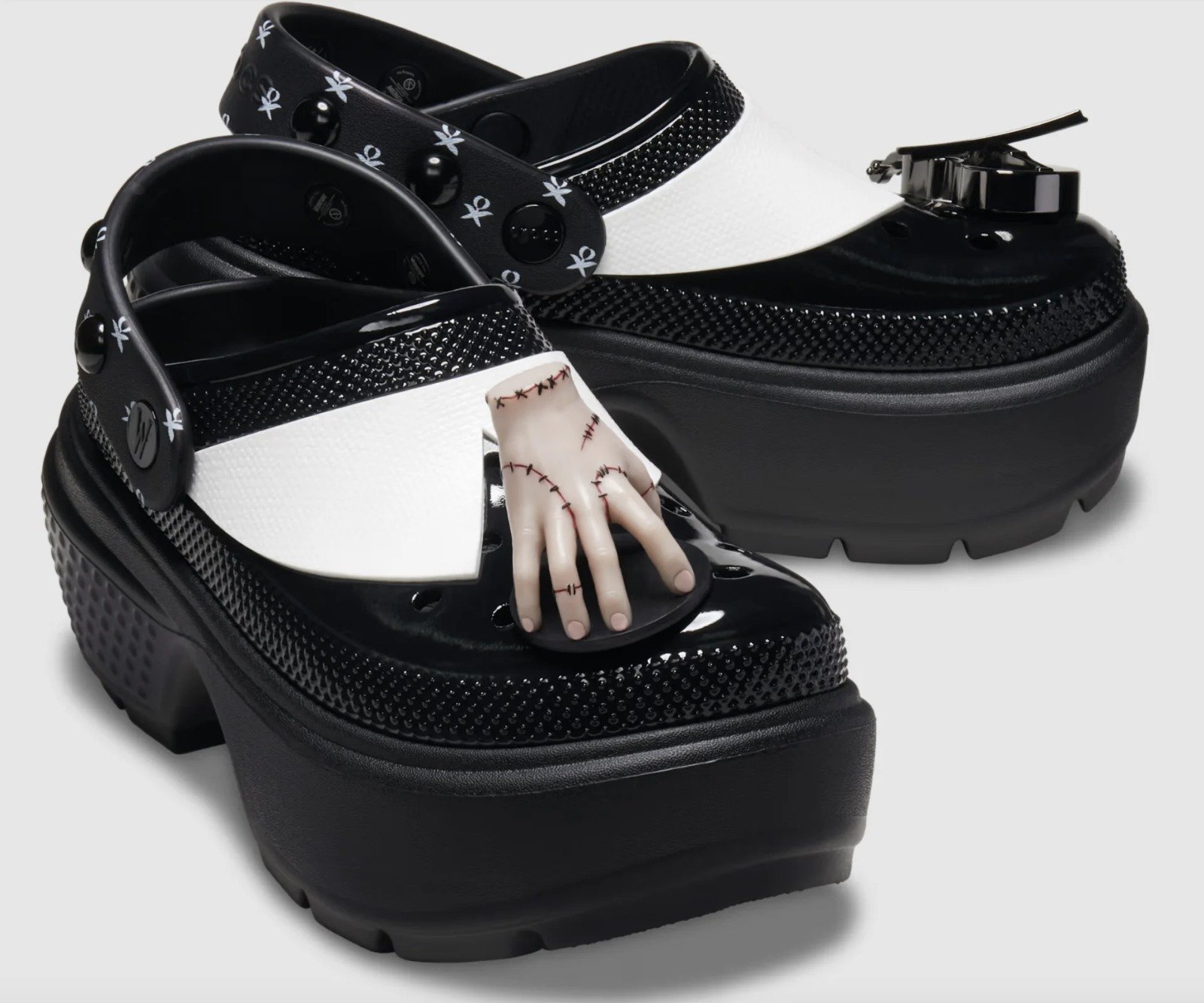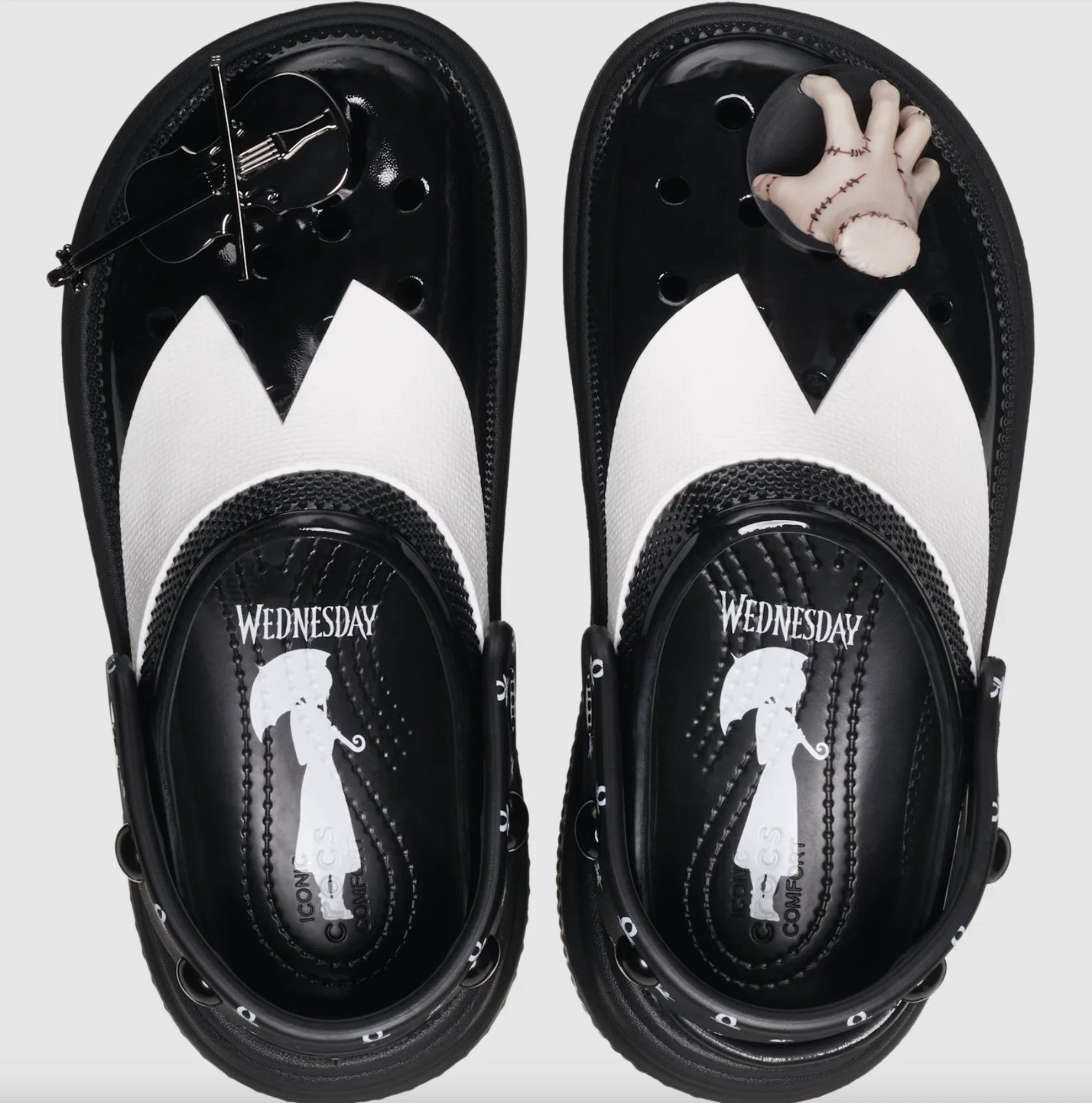 Los Wednesday Stomp Clogs incorporan un distintivo cuello blanco moldeado y una correa de tobillo adornada con tachuelas en forma de cúpula, logrando un estilo gótico y glamoroso. Además, los exclusivos Jibbitz incluyen elementos tridimensionales como Thing y el icónico violonchelo negro de Merlina, ideales para cualquier paria, bicho raro o monstruo, según describe la marca.