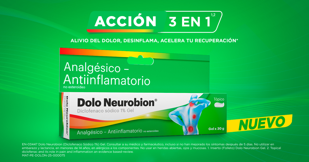 Dolo Neurobion (Diclofenaco Sódico 1%) Gel. EN-03447. Consultar a su médico y farmacéutico, incluso si no han mejorado los síntomas después de 5 días. No utilizar embarazo y lactancia, en menores de 14 años, en alérgicos a los componentes. No usar en heridas abiertas, ojos y mucosas. MAT-PE-DOLON-25-000054