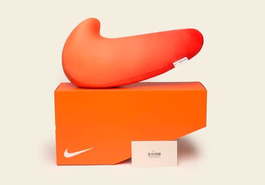 Las tiendas Nike en Hong Kong ofrecen un producto exclusivo, disponible solo en tu cumpleaños. El «Nike Birthday Pillow Gift Box» incluye una caja especial con una almohada naranja en forma de swoosh, etiqueta de membresía y una tarjeta de cumpleaños.