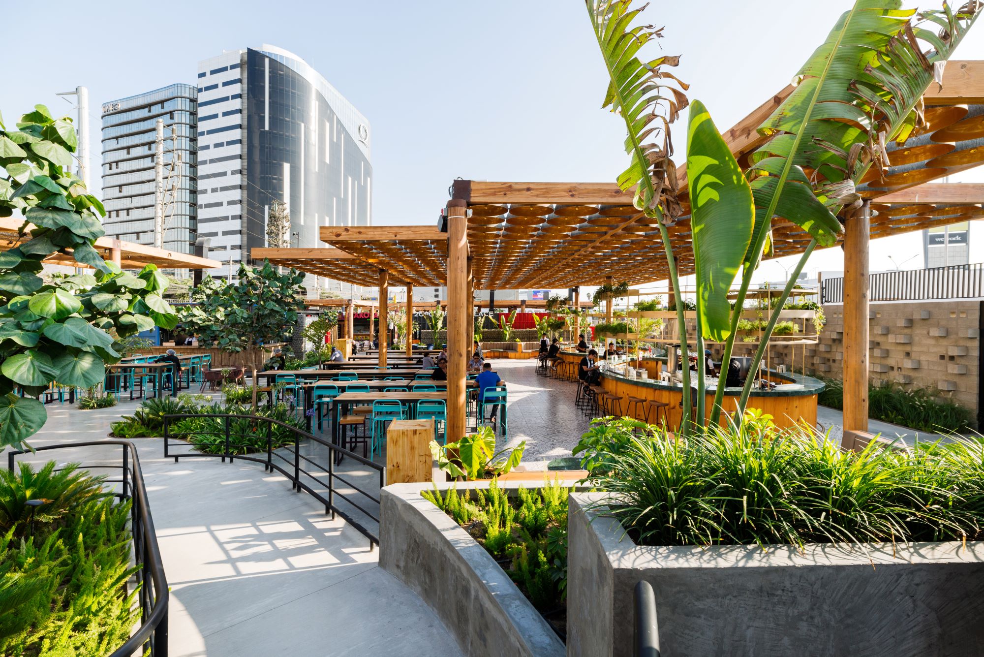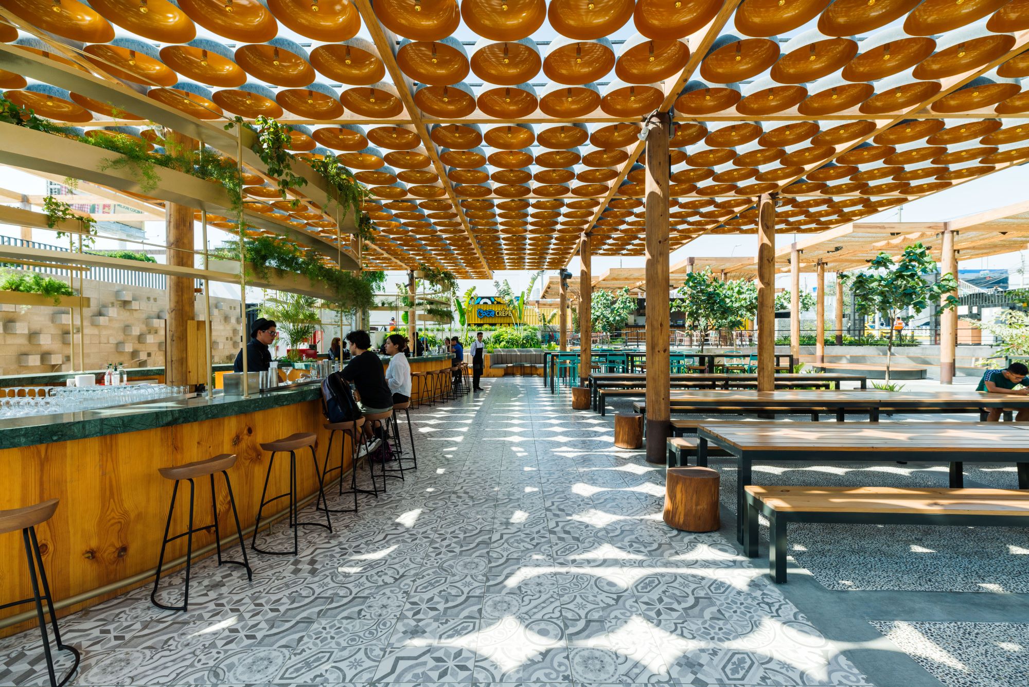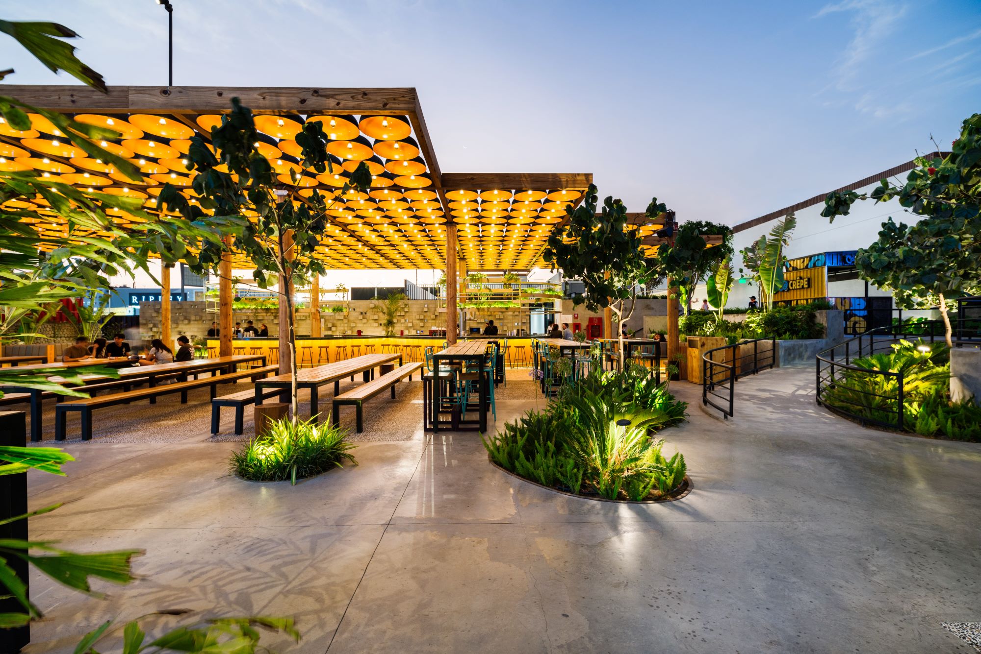Se trata de un espacio ecológico, sostenible, creado en Perú, que se empezó a diseñar en 2019 de la mano del reconocido arquitecto peruano Nikolas Briceño, en colaboración con Lucas Gashu, Claudia Paz y Marilyn Sheppard. El resultado es un parque con un patio de comidas construido con material orgánico: madera, piedras, esterillas y un espacio de 700m2 de áreas verdes; que además, busca reducir el consumo de luz, agua y materiales sintéticos.