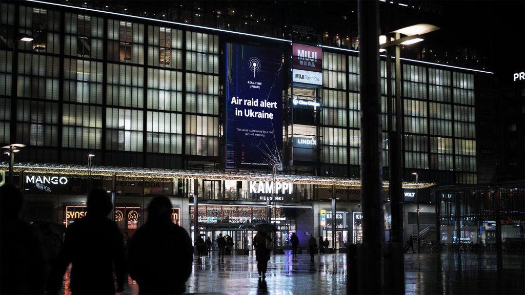 El sistema, desarrollado por el colectivo SipuliGroup, convierte una red de pantallas OOH convencional en un medio reactivo que conecta directamente a Helsinki, a más de 1,300 kilómetros de la frontera ucraniana, con el día a día del conflicto.