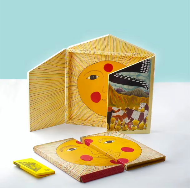 El diseño del empaque, que incluye el disco impreso, el póster y el solapero, se basa en la obra del maestro Marcial Evanan, quien aportó su técnica y estilo gráfico para representar al dios sol.