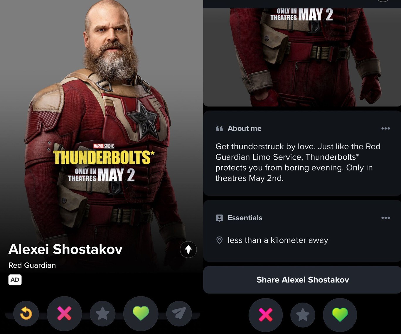 “Déjate alcanzar por el rayo del amor. Igual que el servicio de limusina de Red Guardian, Thunderbolts te protege de una aburrida tarde. Solo en cines el 2 de mayo”, señala su descripción en la app de citas.