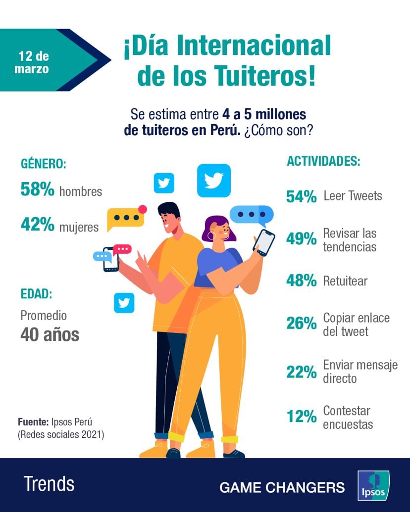 En el marco de la celebración por el Día Internacional de los Tuiteros, Ipsos Perú compartió estadísticas que revelan el perfil de los peruanos en Twitter. La edad promedio de sus usuarios en Perú es de 40 años