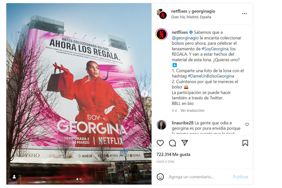 Como parte de su campaña para promocionar la segunda temporada del reality de Georgina Rodríguez, Netflix decidió sorprender a los transeúntes colocando una lona gigante en las calles con el mensaje «Antes coleccionaba bolso, ahora los regala».