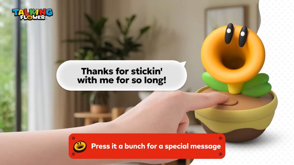 El nuevo gadget de Nintendo está diseñado para ser capaz de hablar en once idiomas y reproducir frases en momentos aleatorios del día. Además, la versión real de la Flor Parlante de Super Mario Bros Wonder está pensada para reproducir el carácter simpático del personaje.