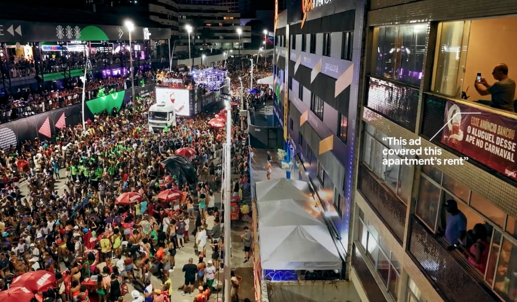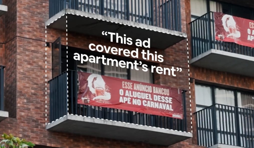 “Ads cover rents”, trabajada por Africa Creative DDB, señalaba que la marca de cerveza pagaría el 50% del alquiler de apartamentos que sean reservados en la plataforma Housi durante el Carnaval. A cambio, los inquilinos tendrían el balcón del lugar brandeado con un banner de Brahma con el mensaje “Esse anúncio bancou o aluguel desse apé no Carnaval” (“Este anuncio pagó el alquiler de este apartamento durante el Carnaval”, en español).