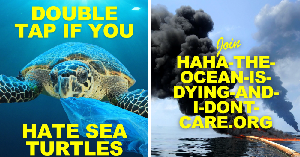 Desde una imagen que muestra el mar contaminado con la frase “Jaja, a veces ocurren derrames de petróleo” u otra en la que aparece un animal con una bolsa en su boca, acompañado de “Toca la bocina si odias a las tortugas marinas”, son parte de la iniciativa de la Organización sin fines de lucro, Surfrider Foundation.