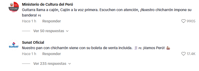 En el sector público, instituciones como la Superintendencia Nacional de Administración Tributaria (SUNAT), el Ministerio de Cultura, el Ministerio de Economía y Finanzas (MEF) e Indecopi sumaron sus comentarios mostrando su apoyo a la tendencia y generando más interacción con el público.