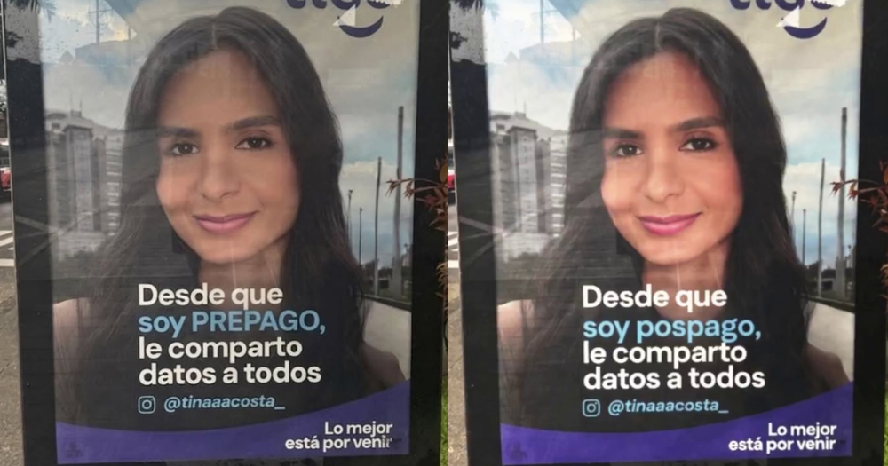La valla original mostraba el mensaje “Desde que soy pospago, le comparto datos a todos”. Sin embargo, la versión manipulada alteró el copy por la frase “Desde que soy prepago, le comparto datos a todos”, introduciendo un término que, en el contexto colombiano, suele utilizarse coloquialmente con una connotación peyorativa vinculada al trabajo sexual. La pieza modificada se difundió rápidamente en redes sociales y plataformas de entretenimiento digital.