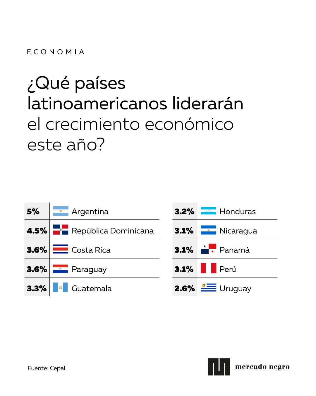 Argentina (5%), República Dominicana (4.5%), Costa Rica (3.6%) y Paraguay (3.6%) liderarán el crecimiento económico este año, según las nuevas cifras de Cepal. Le siguen Guatemala (3.3%), Honduras (3.2%), Nicaragua (3.1%), Panamá (3.1%), Perú (3.1%), Uruguay (2.6%), Colombia (2.5%), El Salvador (2.5%), Chile (2.2%) y Brasil (2%).