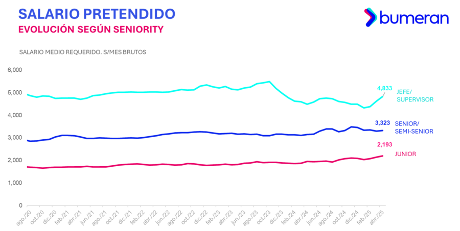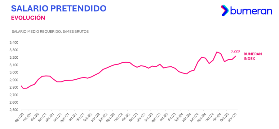 Durante 2025, los mayores incrementos mensuales en el sueldo solicitado se registraron en febrero (0.91%) y abril (1.38%). En abril, el salario promedio pretendido fue de S/ 3,220, tras una baja inicial en enero con S/ 3,145, el valor más bajo del cuatrimestre.