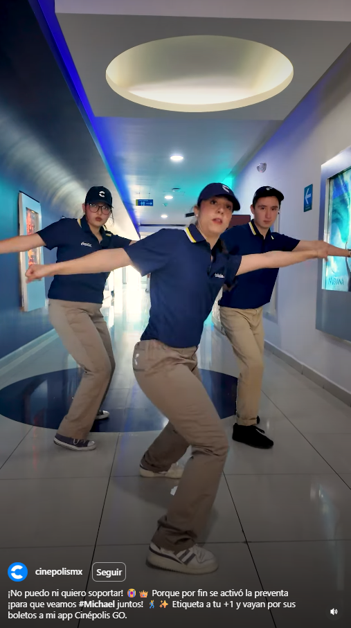 Con una estética más simple y un gancho que invita a compartir la publicación, Cinépolis eligió a tres de sus trabajadores para bailar la clásica canción de Michael Jackson. Acompañado de la frase “Yo después de comprar mis boletos para Michael”, el video superó los 100 mil likes en menos de una semana.