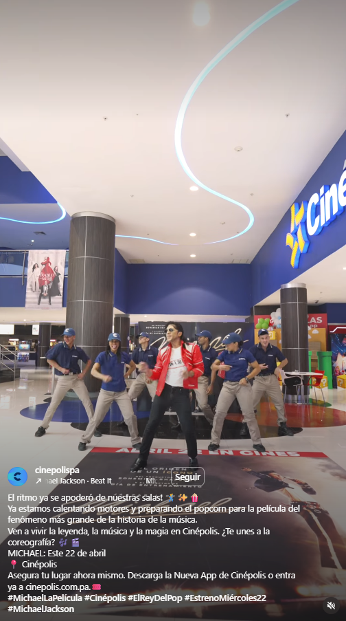 Cinépolis Panamá amplió la apuesta al traer a un imitador de Michael Jackson para poner a bailar a sus empleados. La cadena apeló al storytelling al agregar al inicio del video una pequeña historia de cómo los trabajadores dejan de realizar sus funciones al escuchar el ritmo de Beat It.
