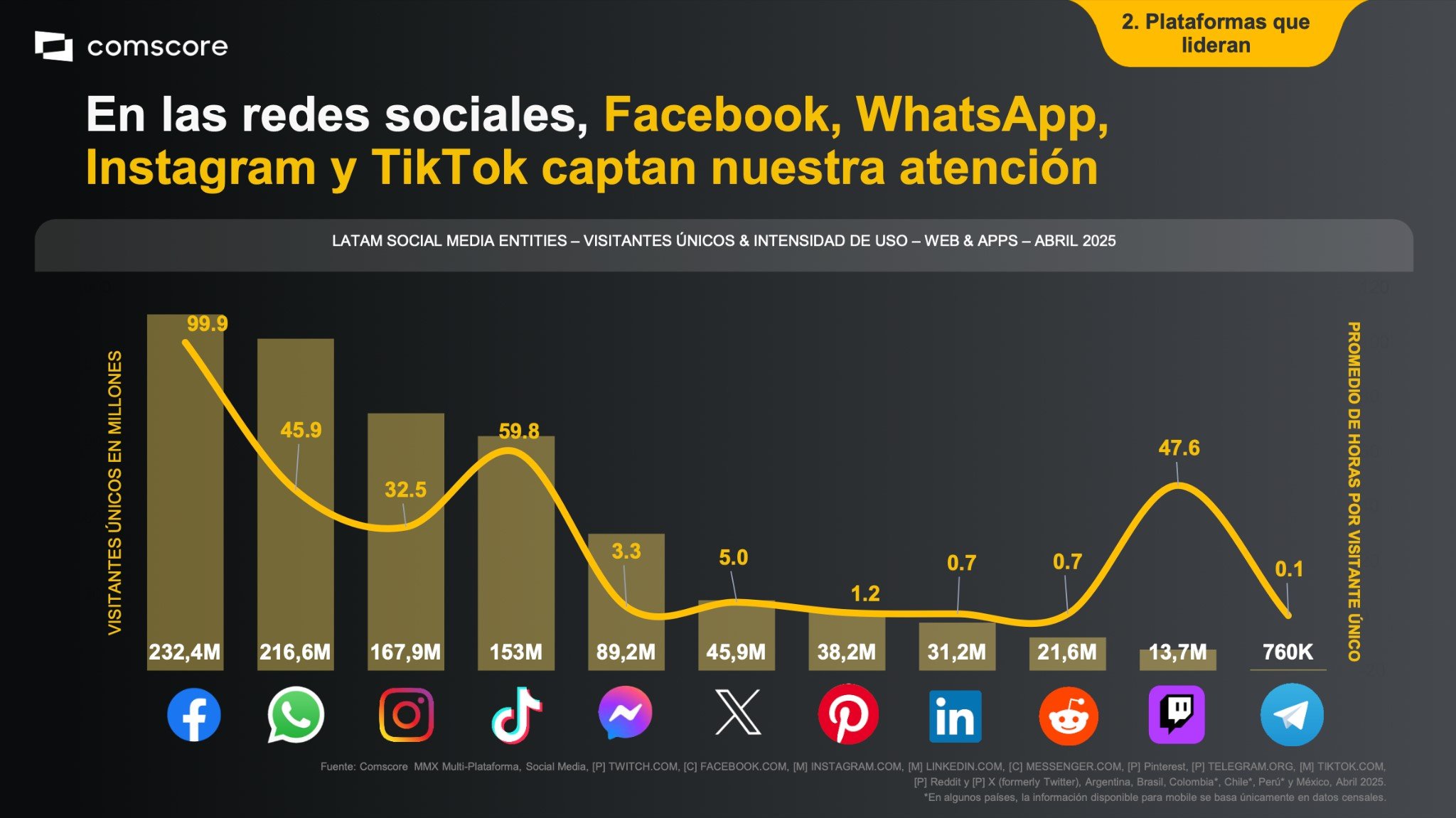 El estudio de Comscore muestra que Facebook, WhatsApp, Instagram y TikTok se consolidan como algunas de las plataformas que más captaron su atención. En abril de 2025, registraron 232, 217, 168 y 153 millones de visitantes únicos mensuales, respectivamente.