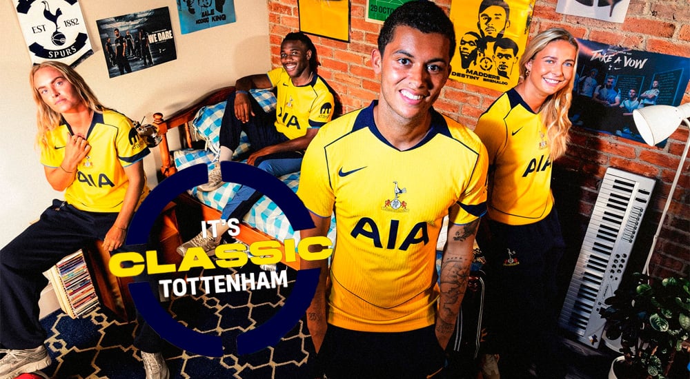La tercera indumentaria para la temporada 2025/26 fusiona los colores clásicos del Tottenham con detalles en amarillo y azul, evocando a la clásica pelota Nike Total 90. El spot, realizado por la agencia creativa T&P, está ambientado en una lujosa casa del norte de Londres.